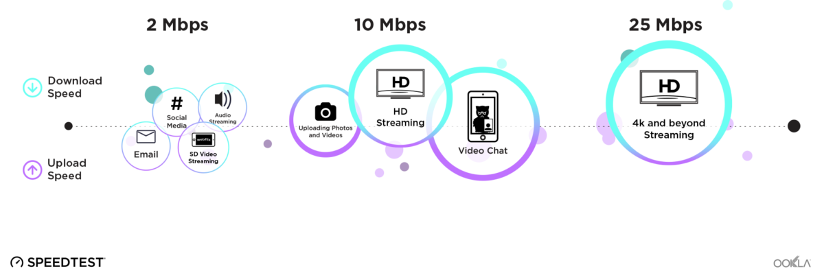 At the end of the Speedtest, each icon is assigned a 1-5 dot score (1: poor, 5: excellent), indicating the expected performance level for that activity. These icons represent online experiences that require varying levels of network performance.